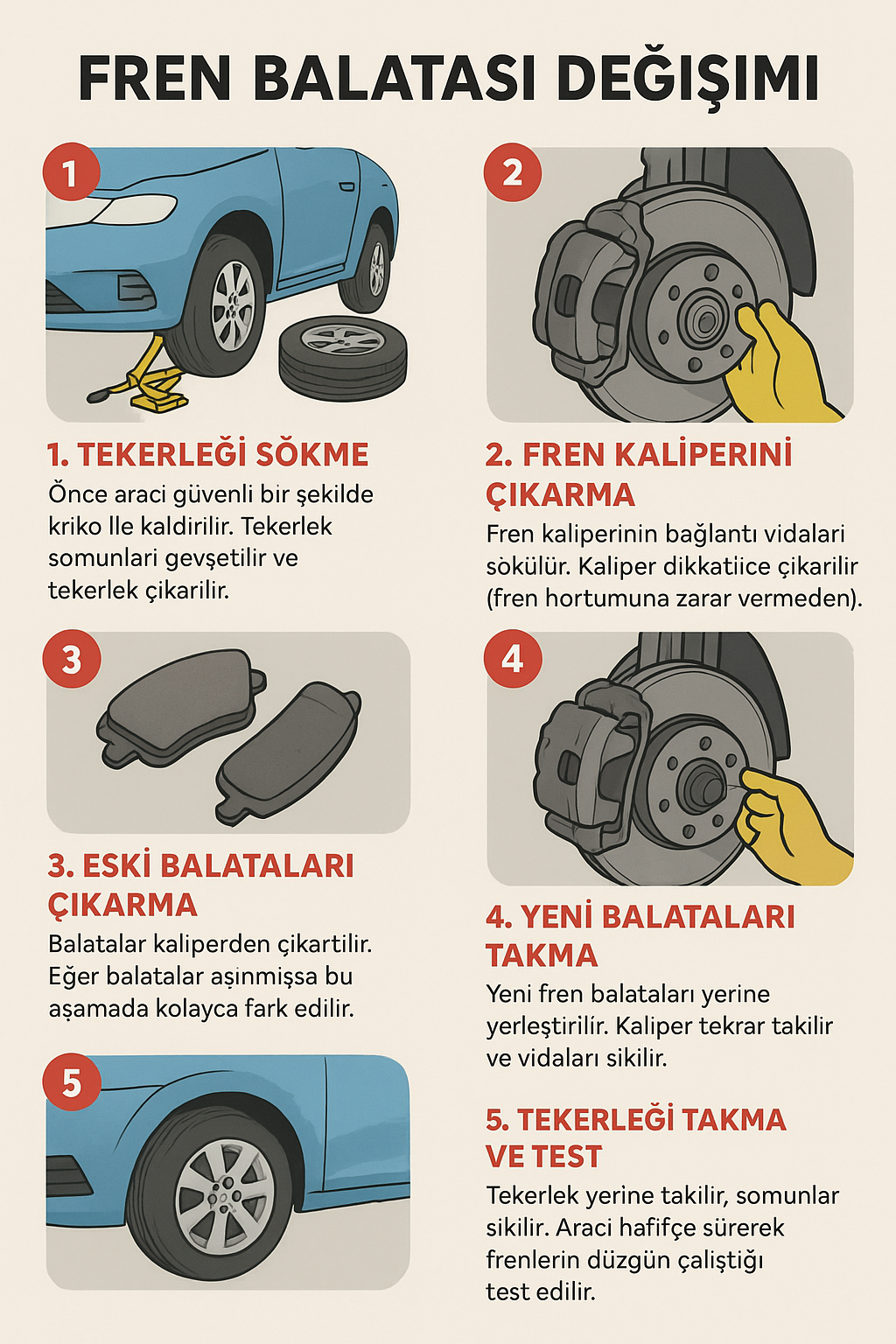 Fren balataları, aracın güvenliğini sağlayan en önemli parçalardan biridir. Zamanla sürtünme yüzeyleri aşınır ve frenleme mesafesi uzar. Aşınmış balatalar hem disklerin zarar görmesine hem de fren performansının ciddi şekilde düşmesine neden olabilir. Fren balatası değişiminde öncelikle tekerlekler sökülür, eski balatalar kaliperden çıkarılır ve yeni balatalar yerine takılır. Ardından sistem kontrol edilerek tekerlekler yeniden monte edilir. Düzenli aralıklarla balata değişimi yapılması, güvenli sürüş için hayati önem taşır ve aracın fren sisteminin uzun ömürlü olmasını sağlar.